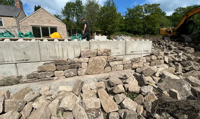 This project involved creating a natural stone water-defence cladding system for a riverside property in Belper. The house sits approximately 10 feet above river level, meaning flood protection was essential, but any work also had to respect the character and requirements of a listed building.